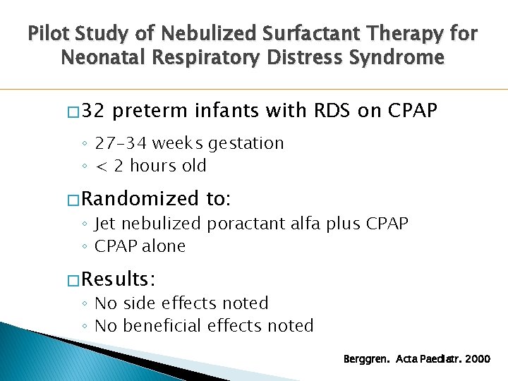 Surfactant (beractant used in trials) administration in ventilated infants with meconium aspiration syndrome (mas) has been found to improve oxygenation in most studies but there. Some babies, however, particularly premature babies, do not have enough of this surfactant when they are born, which causes rds. To treat infants with rds confirmed by radiographic and clinical findings, give the first dose of survanta as soon as possible, preferably by 8 hours of age.